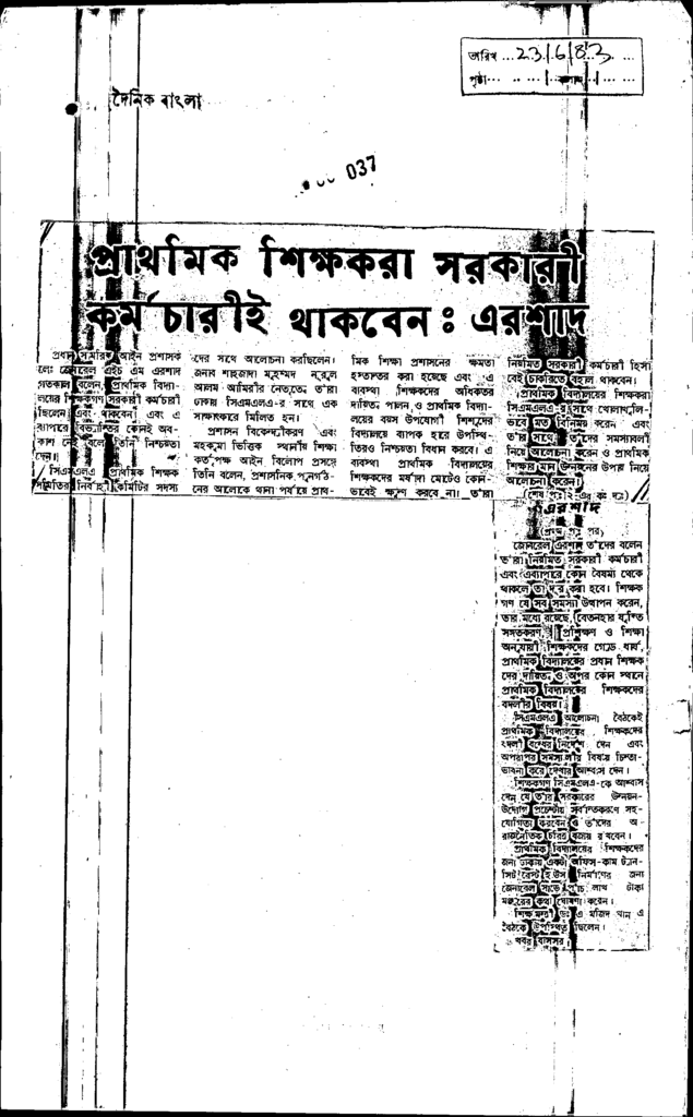 প্রাথমিক শিক্ষকরা সরকারী কর্মচারীই থাকবেনঃ এরশাদ Published on Newspaper দৈনিক বাংলা Category Campus Terrorism Download