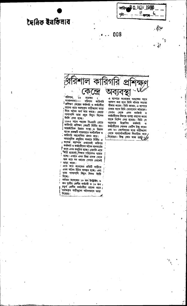 বরিশাল কারিগরি প্রশিক্ষণ কেন্দ্রে অব্যবস্থা Published on Newspaper দৈনিক ইনকিলাব Category Technical and Vocational Education Download