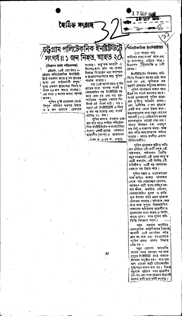 চট্রগ্রাম পলিটেকনিক ইনষ্টিটিউটে সংঘর্ষ । ১জন নিহত আহত ২০ Published on Newspaper দৈনিক সংবাদ Category Technical and Vocational Education Download
