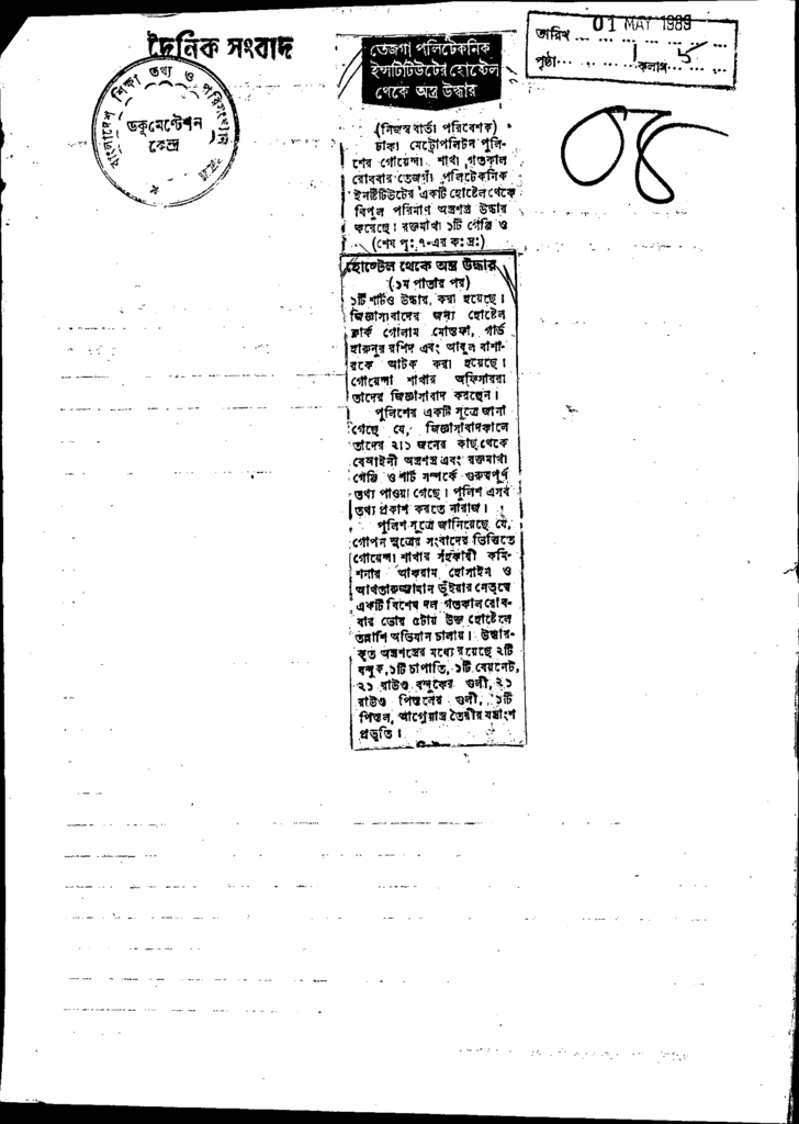তেজগা পলিটেকনিক ইন্সটিটিউটের হোষ্টেল থেকে অস্ত্র উদ্ধার Published on Newspaper দৈনিক সংবাদ Category Technical and Vocational Education Download