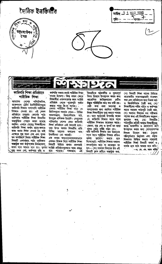 শিক্ষাঙ্গন কারিগরি শিক্ষা প্রতিষ্ঠানে শারীরিক শিক্ষা Published on Newspaper দৈনিক ইনকিলাব Category Technical and Vocational Education Download