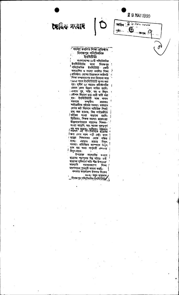 সমস্যা কবলিত শিক্ষা প্রতিষ্ঠান দিনাজপুর পলিটেকনিক ইনষ্টিটিউট Published on Newspaper দৈনিক সংবাদ Category Technical and Vocational Education Download