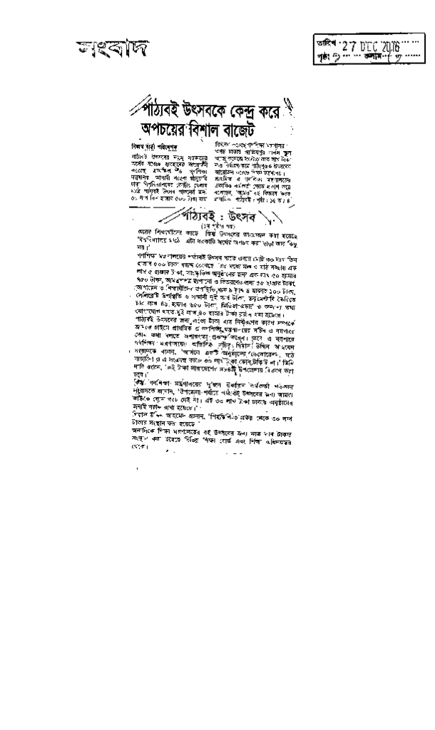 পাঠ্যবই উৎসবকে কেন্দ্র করে অপচয়ের বিশাল বাজেট Published on Newspaper দৈনিক সংবাদ Category Book Fair Download