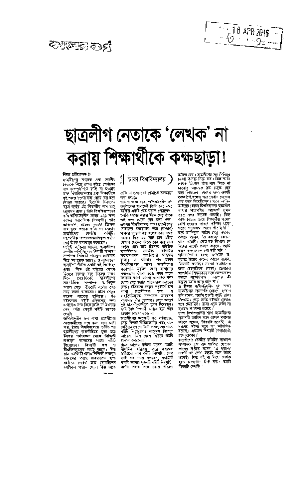 ছাত্রলীগ নেতাকে ‘লেখক’ না করায় শিক্ষার্থীকে কক্ষছাড়া ! Published on Newspaper দৈনিক কালের কন্ঠ Category Student Politics Download