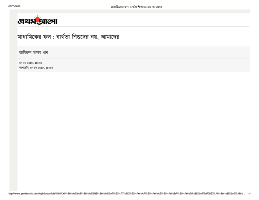 মাধ্যমিকের ফল_ ব্যর্থতা শিশুদের নয়, আমাদের Published on Newspaper দৈনিক প্রথম আলো Category Personal Opinion / Discussion / Commentary Personal Speech / Discussion / Comentary Secondary and Higher Secondary Education Download