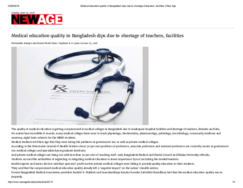 Medical education quality in Bangladesh dips due to shortage of teachers, facilities _ New Age Published on Newspaper New Age Category Professional Education Professional Education Medical Download