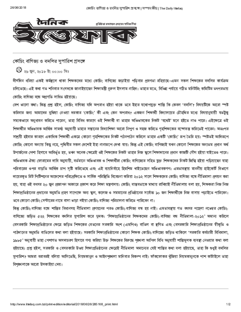 কোচিং বাণিজ্য ও বদলির সুপারিশ প্রসঙ্গে _ সম্পাদকীয় _ The Daily Ittefaq Published on Newspaper দৈনিক ইত্তেফাক Category Personal Opinion / Discussion / Commentary Personal Speech / Discussion / Comentary Secondary and Higher Secondary Education Download