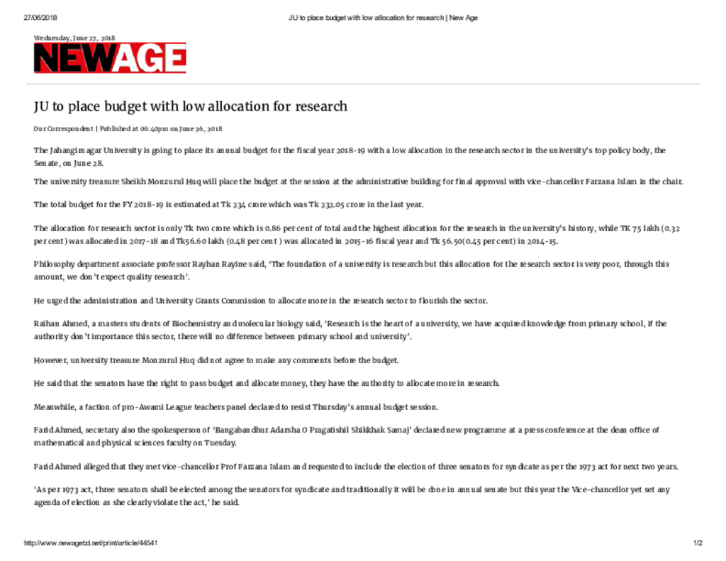 JU to place budget with low allocation for research _ New Age Published on Newspaper New Age Category General Education General Education Higher Education Public Download