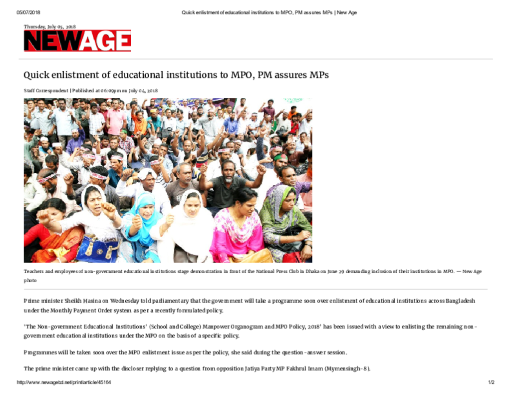 Quick enlistment of educational institutions to MPO, PM assures MPs _ New Age Published on Newspaper New Age Category Educational Ministry / Departments Education Ministry / Division / Directorate Download