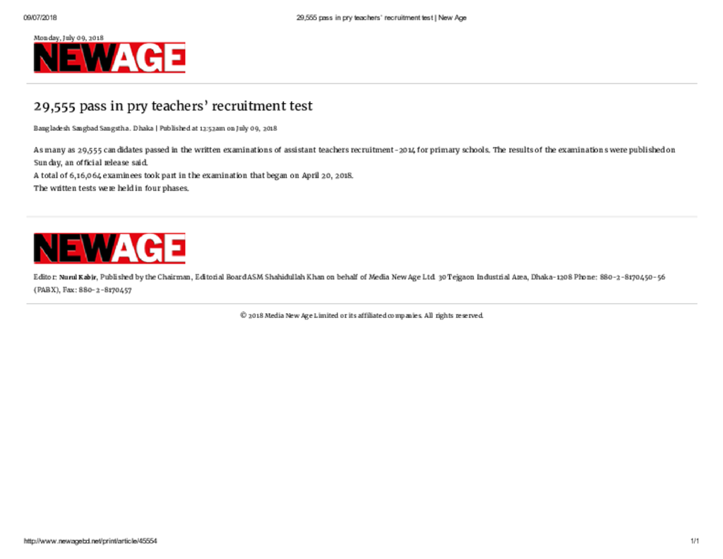 29,555 pass in pry teachers’ recruitment test _ New Age Published on Newspaper New Age Category Educational Ministry / Departments Education Ministry / Division / Directorate Download