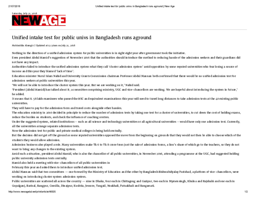 Unified intake test for public univs in Bangladesh runs aground _ New Age Published on Newspaper New Age Category Admission / Seat Problem Admission/Seat Problem Download