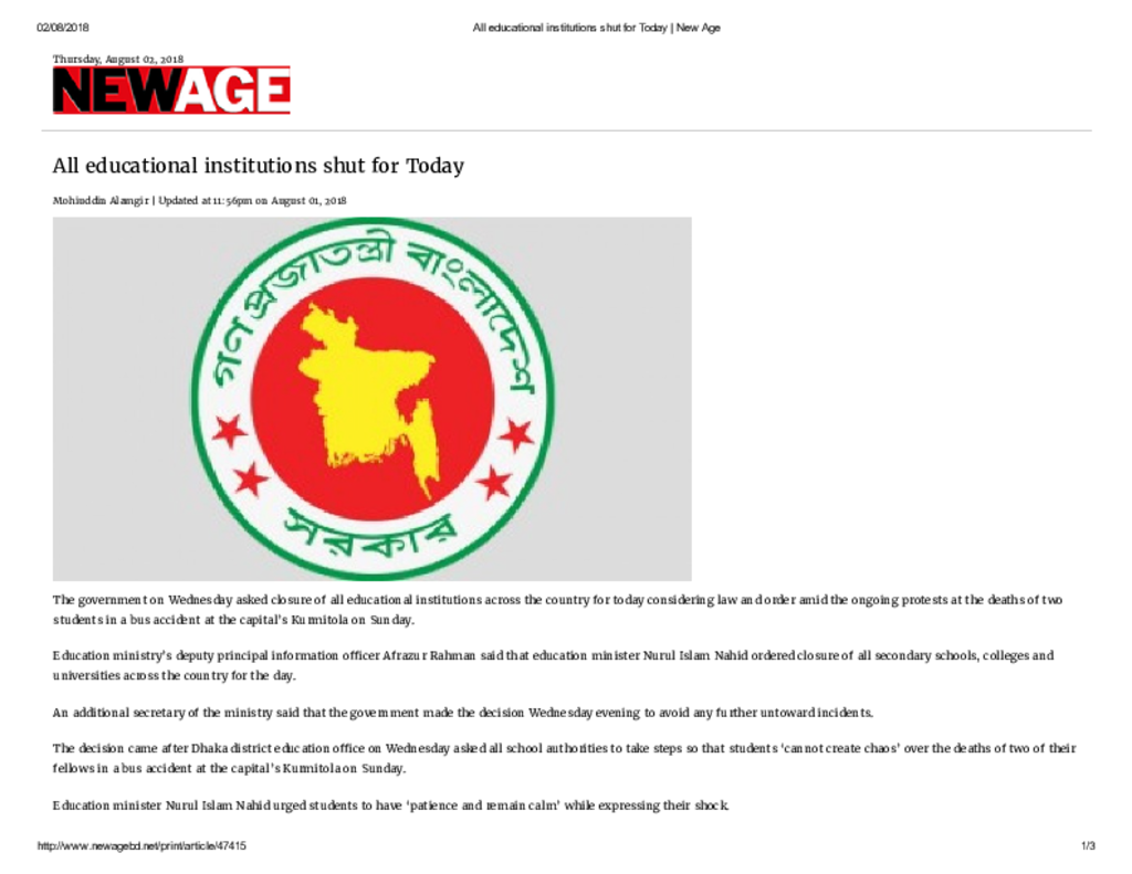 All educational institutions shut for Today _ New Age Published on Newspaper New Age Category Educational Ministry / Departments Download