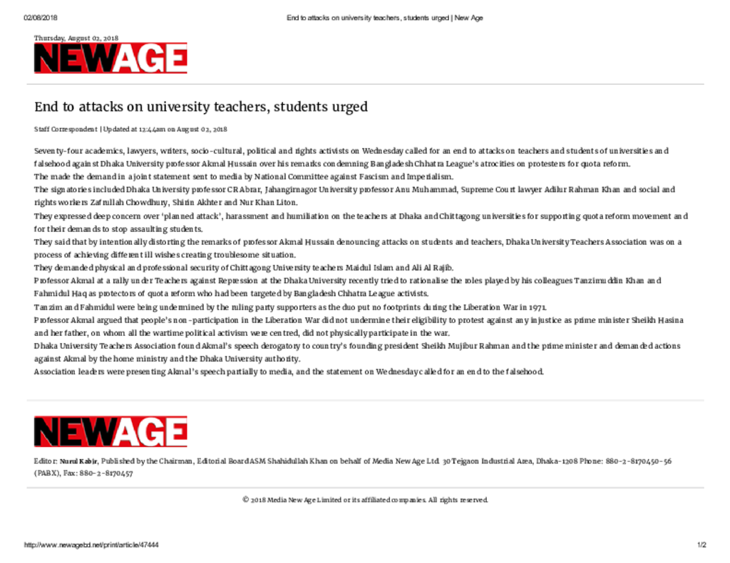 End to attacks on university teachers, students urged _ New Age Published on Newspaper New Age Category Others Download
