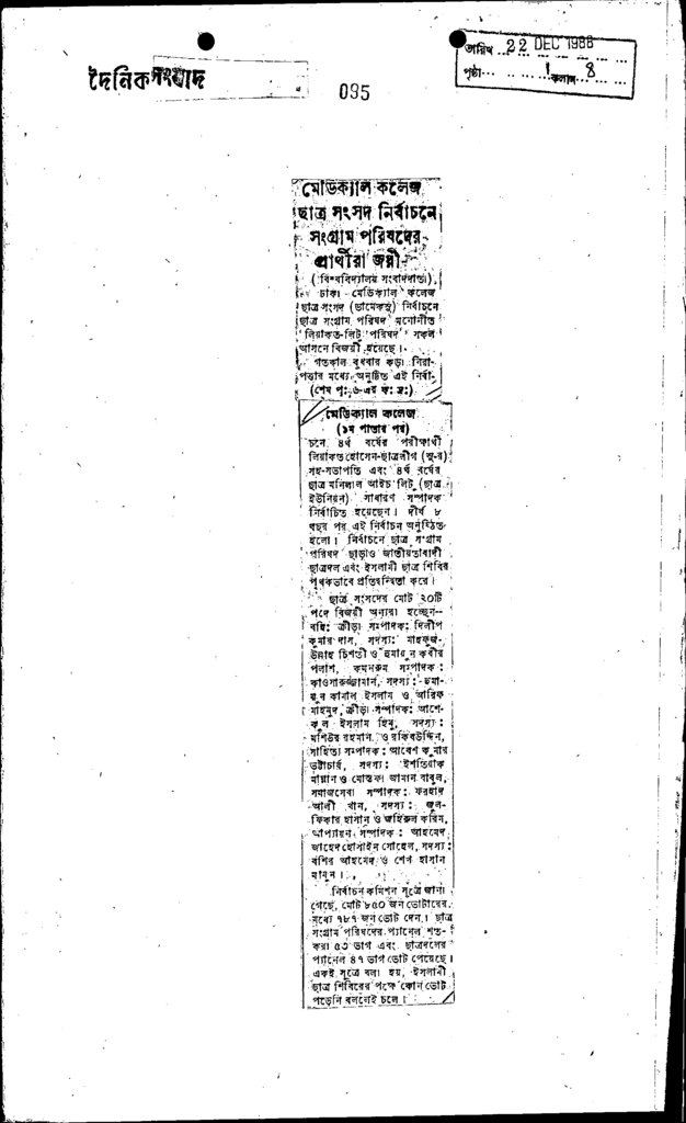 মেডিক্যাল কলেজ ছাত্র সংসদ নির্বাচনে সংগ্রাম পরিষদের প্রার্থীরা জয়ী