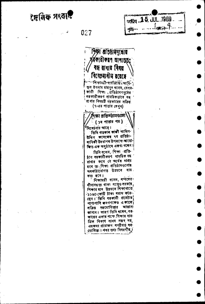 শিক্ষাপ্রতিষ্ঠানগুলোর সরকারীকরণ আপাততঃ বধ্ন রাখার বিয়ষ বিবেনাধীণ রয়েছে Published on Newspaper দৈনিক সংবাদ Category Technical and Vocational Education Download