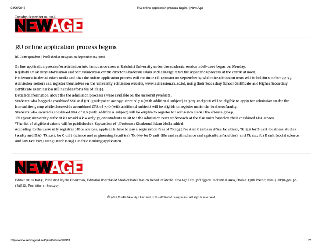 RU online application process begins _ New Age Published on Newspaper New Age Category Admission / Seat Problem Admission/Seat Problem Download