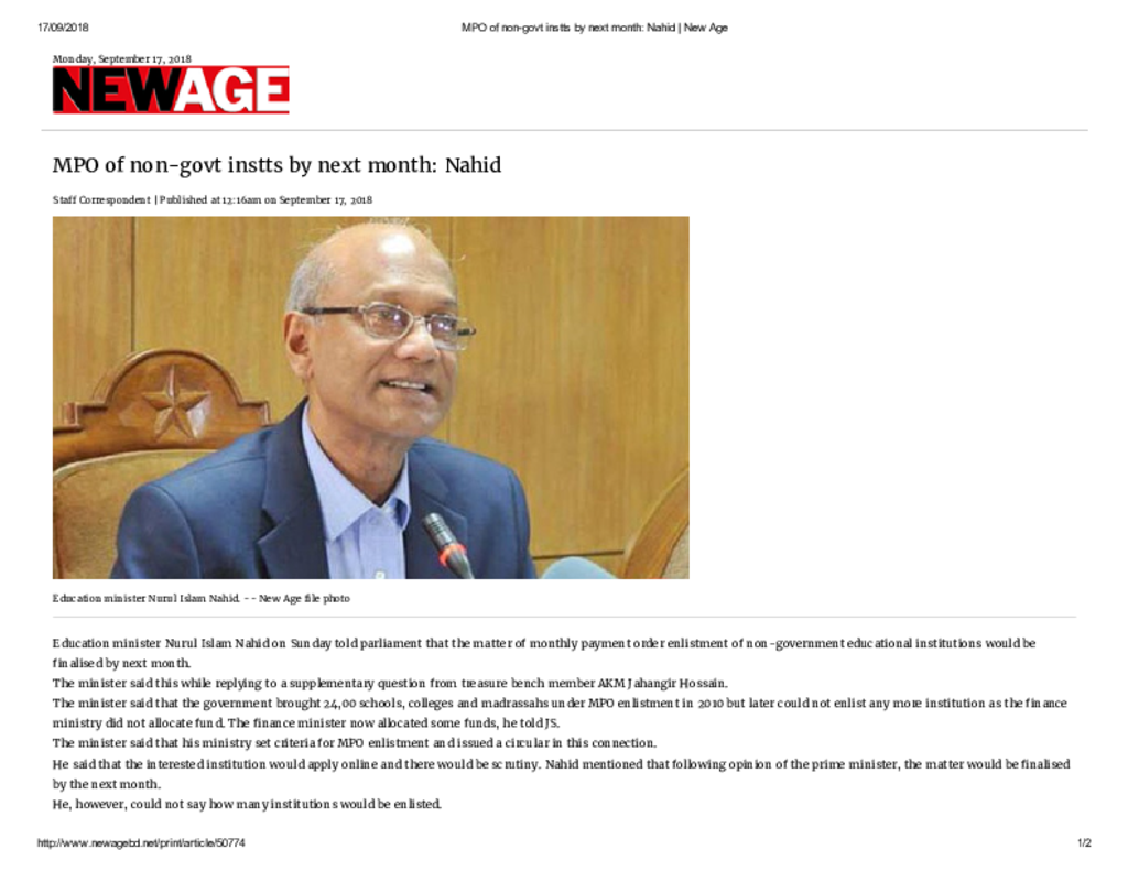 MPO of non-govt instts by next month_ Nahid _ New Age