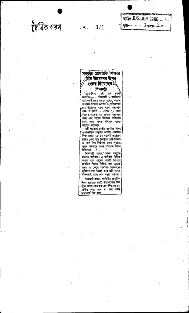 সরকার প্রাথমিক শিক্ষার মান উন্নয়নের উপর গুরুত্ব দিয়েছেন ঃ শিক্ষামন্ত্রী Published on Newspaper দৈনিক খবর Category General Education General Education Download