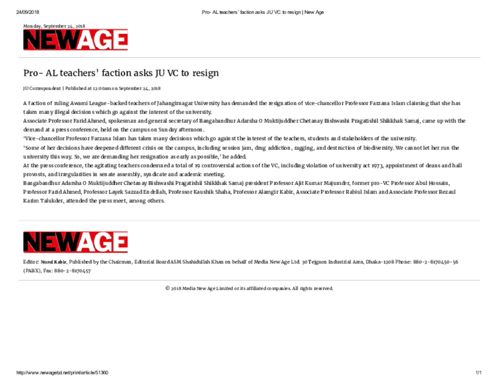 Pro- AL teachers’ faction asks JU VC to resign _ New Age Published on Newspaper New Age Category Others Download