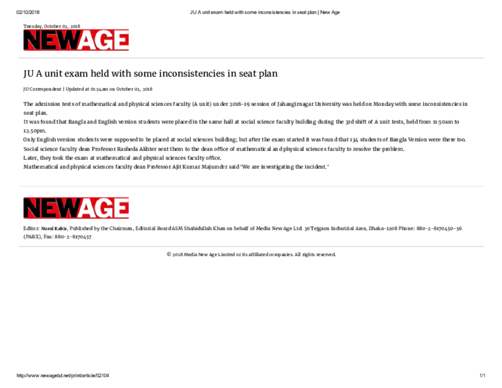 JU A unit exam held with some inconsistencies in seat plan _ New Age Published on Newspaper New Age Category Admission / Seat Problem Admission/Seat Problem Download
