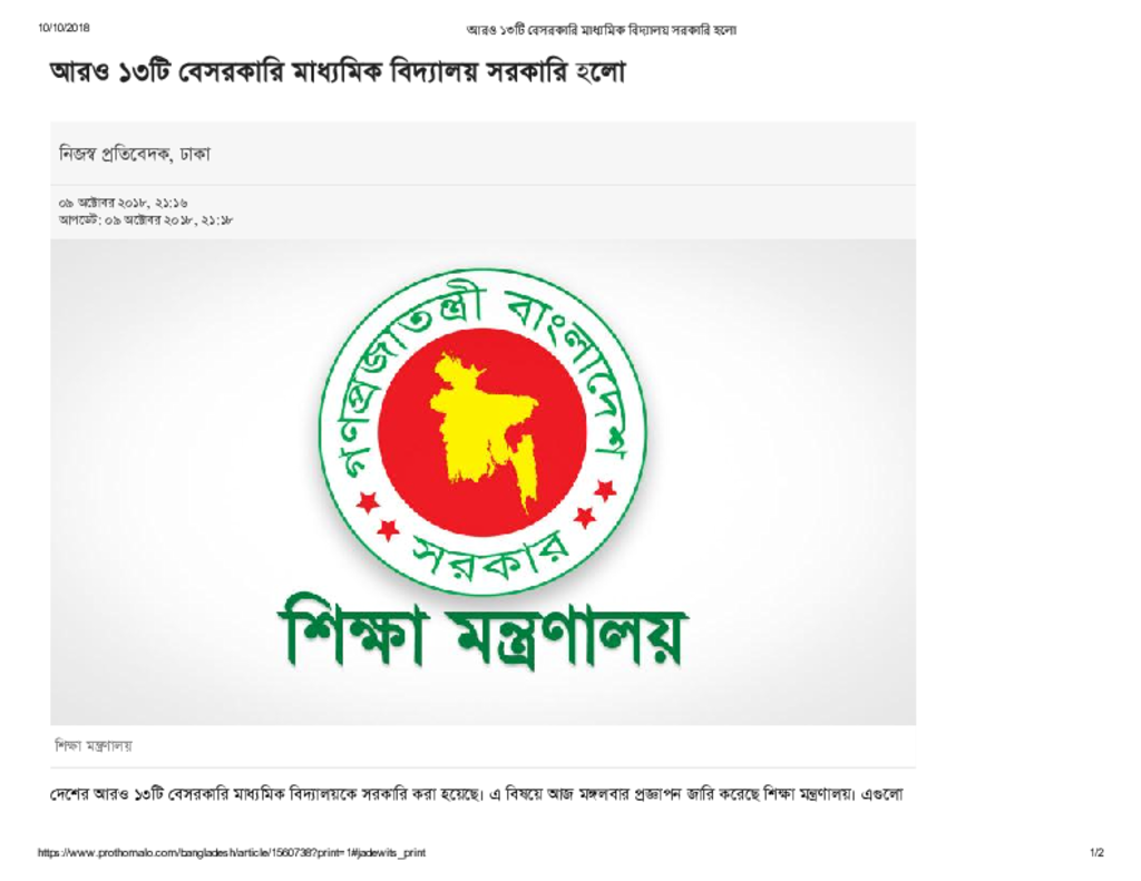 আরও ১৩টি বেসরকারি মাধ্যমিক বিদ্যালয় সরকারি হলো