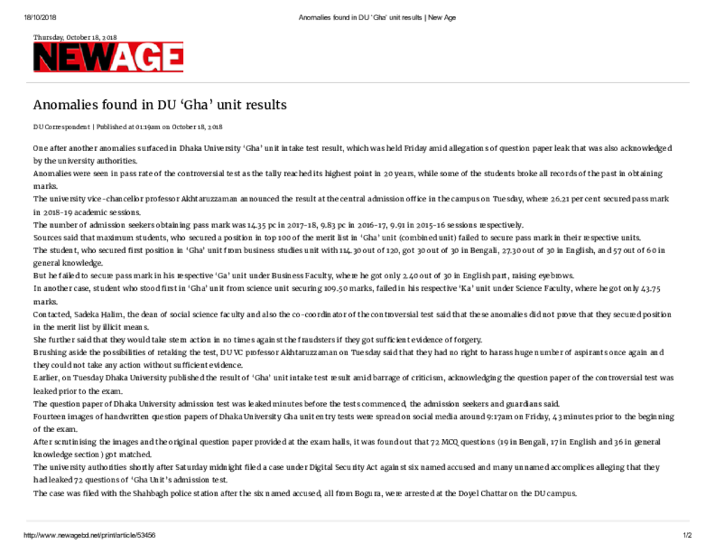 Anomalies found in DU ‘Gha’ unit results _ New Age Published on Newspaper New Age Category Admission / Seat Problem Admission/Seat Problem Download