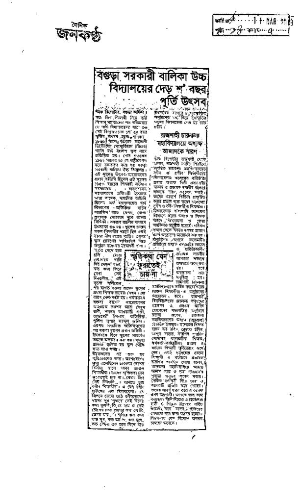 বগুড়া সরকারি বালিকা উচ্চ বিদ্যালয়ের দেড়শ’ বছর পূর্তি উৎসব Published on Newspaper দৈনিক জনকণ্ঠ Category Educational Week Download