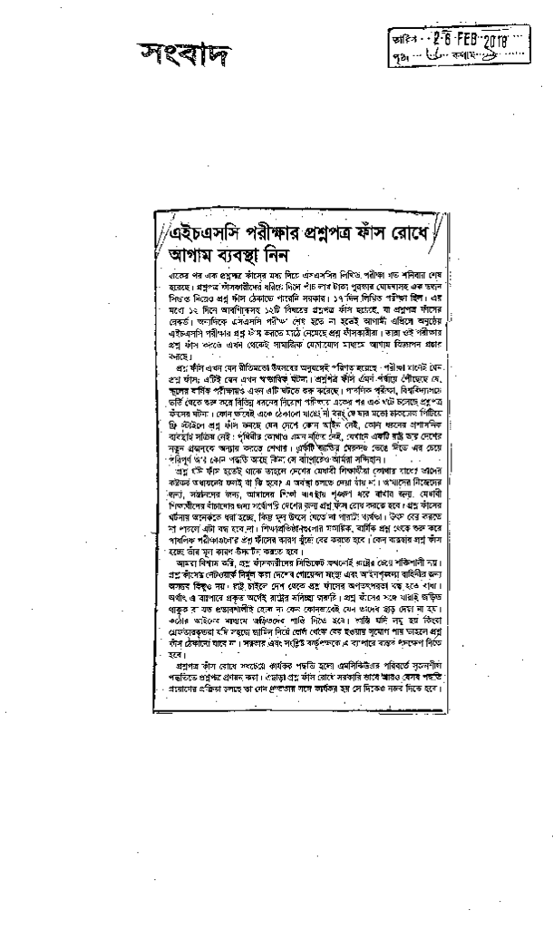 এইচএসসি পরীক্ষার প্রশ্নপত্র ফাঁস রোধে আগাম ব্যবস্থা নিন Published on Newspaper দৈনিক সংবাদ Category Public Examination Public Examination HSC Download