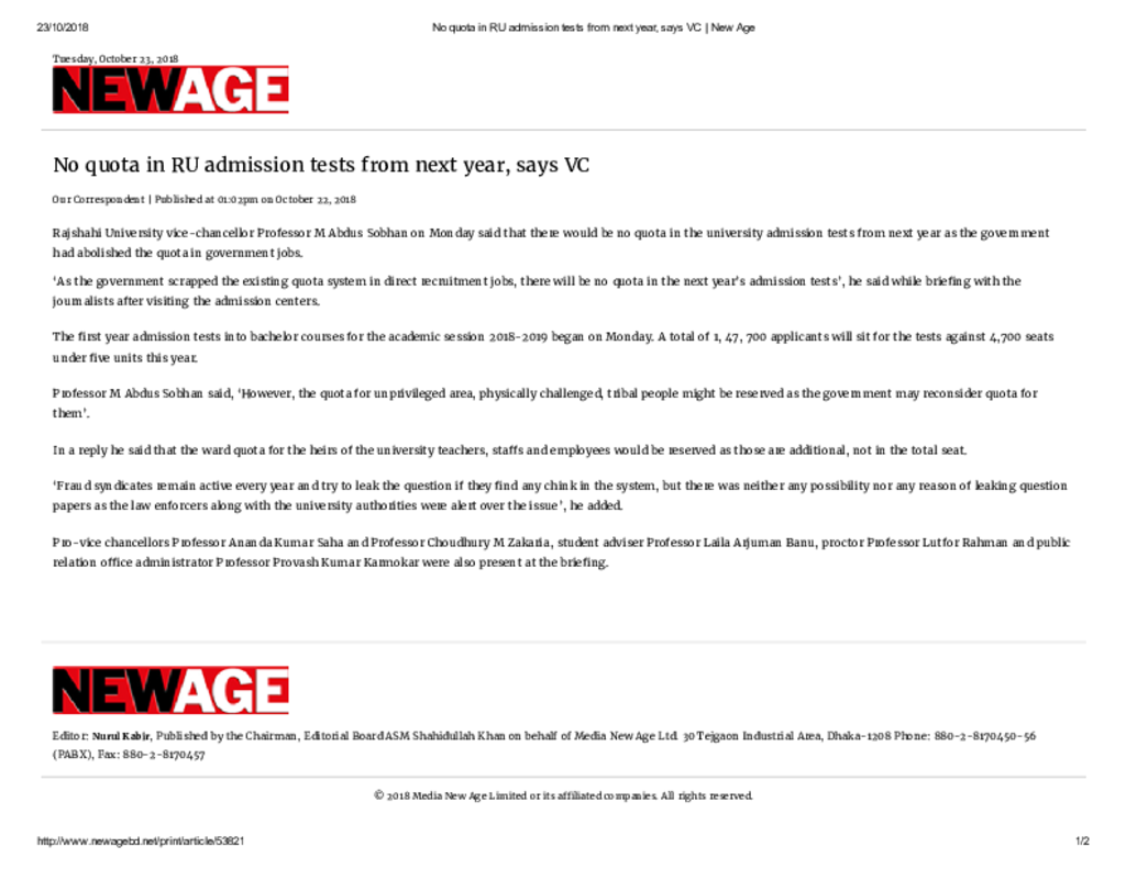 No quota in RU admission tests from next year, says VC _ New Age Published on Newspaper New Age Category Admission / Seat Problem Admission/Seat Problem Download