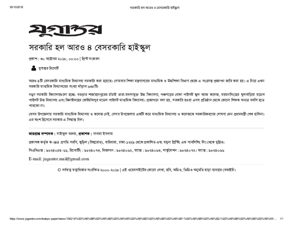 সরকারি হল আরও ৪ বেসরকারি হাইস্কুল Published on Newspaper দৈনিক যুগান্তর Category Educational Ministry / Departments Division Secondary and Higher Education Education Ministry / Division / Directorate Download