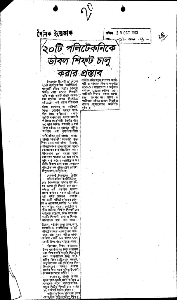 ২০ টি পলিটেকনিকে ডাবল শিফট চালু করার প্রস্তাব Published on Newspaper দৈনিক ইত্তেফাক Category Technical and Vocational Education Download