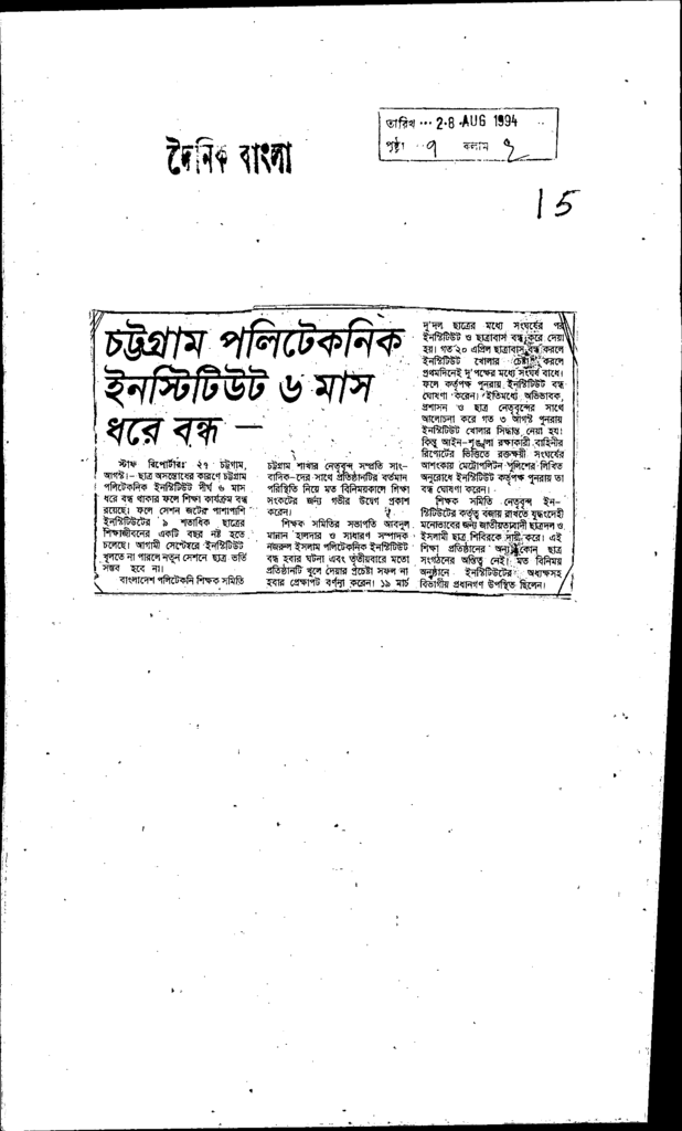 চট্রগ্রাম পলিটেকনিক ইনস্টিটিউট ৬ মাস ধরে বন্ধ Published on Newspaper দৈনিক বাংলা Category Technical and Vocational Education Download