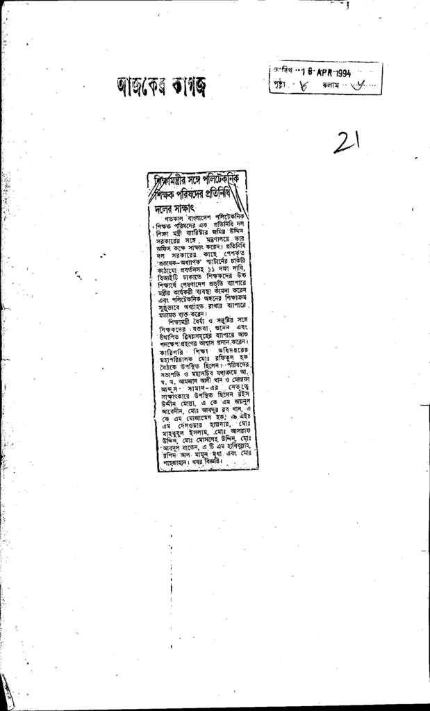 শিক্ষামন্ত্রীর সঙ্গে পলিটেকনিক শিক্ষক পরিষদের প্রতিনিধি দলের সাক্ষাৎ Published on Newspaper দৈনিক আজকের কাগজ Category Technical and Vocational Education Download