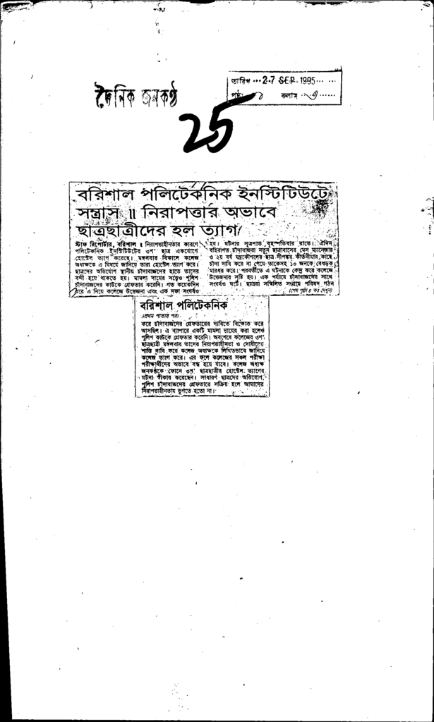 বরিশাল পলিটেকনিক ইনস্টিটিউটে সন্ত্রাস নিরাপওার অভাবে ছাত্রছাত্রীদের হল ত্যাগ Published on Newspaper দৈনিক জনকণ্ঠ Category Technical and Vocational Education Download