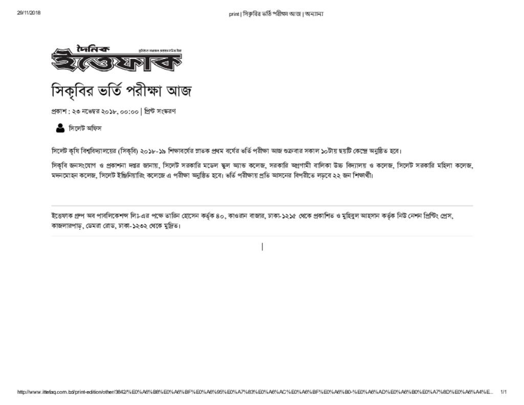print _ সিকৃবির ভর্তি পরীক্ষা আজ _ অন্যান্য Published on Newspaper দৈনিক ইত্তেফাক Category Professional Education Professional Education Others Download