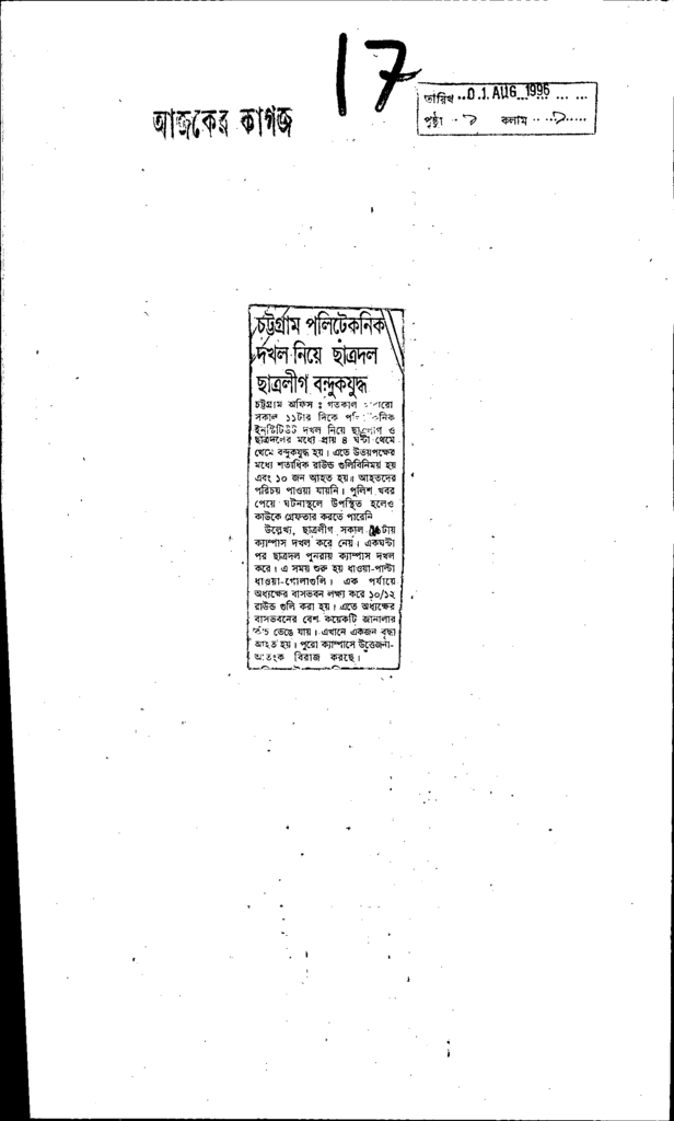 চট্রগ্রাম পলিটেকনিক দখল নিয়ে ছাত্রদল ছাত্রলীগ বন্দুকযুদ্ধ Published on Newspaper দৈনিক আজকের কাগজ Category Technical and Vocational Education Download