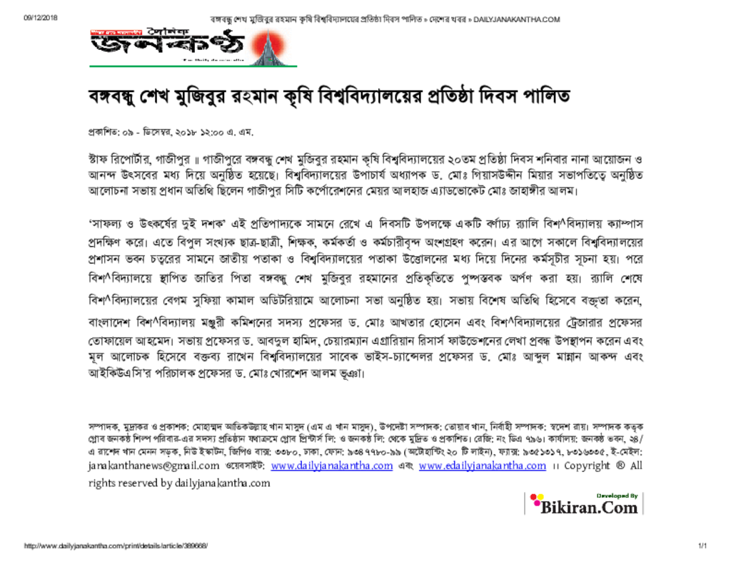 বঙ্গবন্ধু শেখ মুজিবুর রহমান কৃষি বিশ্ববিদ্যালয়ের প্রতিষ্ঠা দিবস পালিত » দেশের খবর » DAILYJANAKANTHA