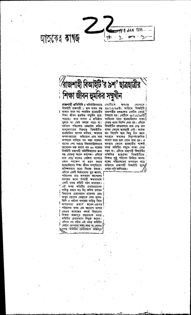 রাজশাহী বি্টির ৯শ ছাত্রছাত্রীর শিক্ষা জীবন হুমকির কম্মুখীন Published on Newspaper দৈনিক আজকের কাগজ Category ICT Education Download