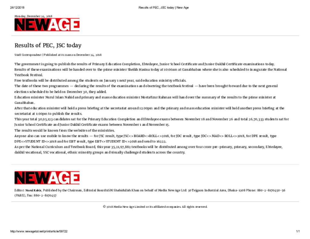 Results of PEC, JSC today _ New Age Published on Newspaper New Age Category Public Examination Public Examination JSC Download