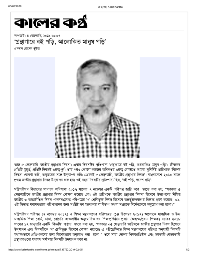 গ্রন্থাগারে বই পড়ি, আলোকিত মানুষ গড়ি’ Published on Newspaper দৈনিক কালের কন্ঠ Category Book Day Download Statistics 1 download