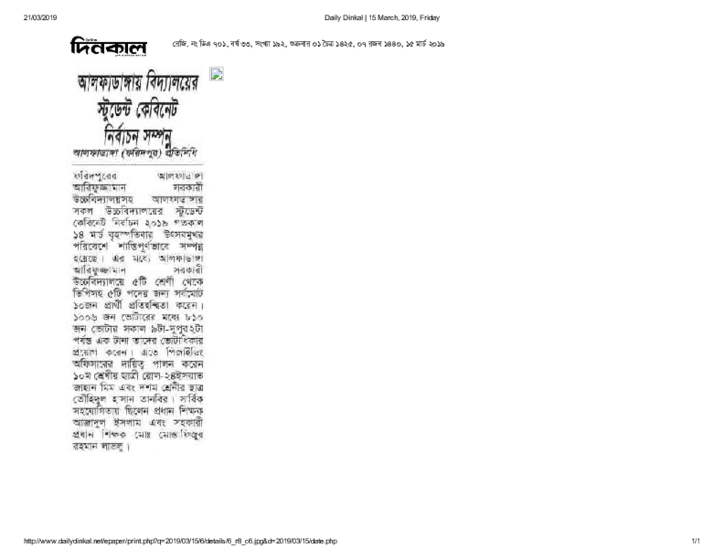 আলফাডাঙ্গায় বিদ্যালয়ের স্টুডেন্ট কেবিনেট নির্বাচন সম্পন্ন Published on Newspaper দৈনিক দিনকাল Category Student Politics Download Statistics 5 downloads
