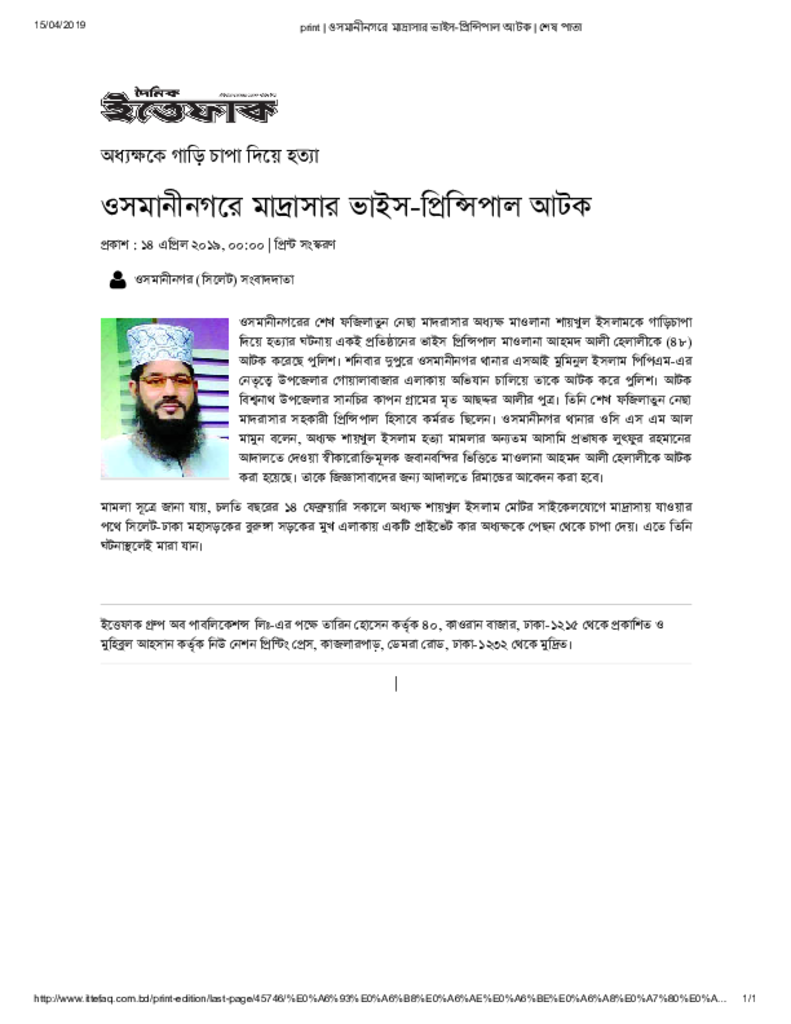 print _ ওসমানীনগরে মাদ্রাসার ভাইস-প্রিন্সিপাল আটক _ শেষ পাতা