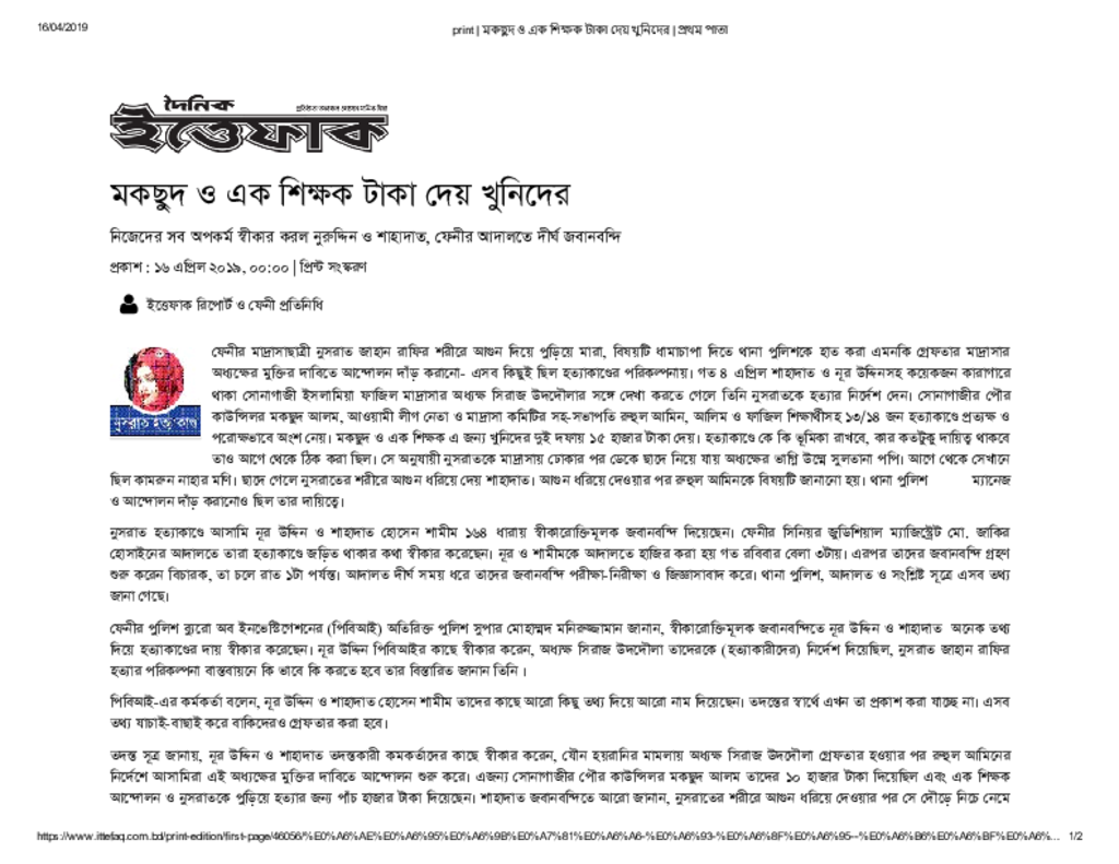 print _ মকছুদ ও এক শিক্ষক টাকা দেয় খুনিদের _ প্রথম পাতা
