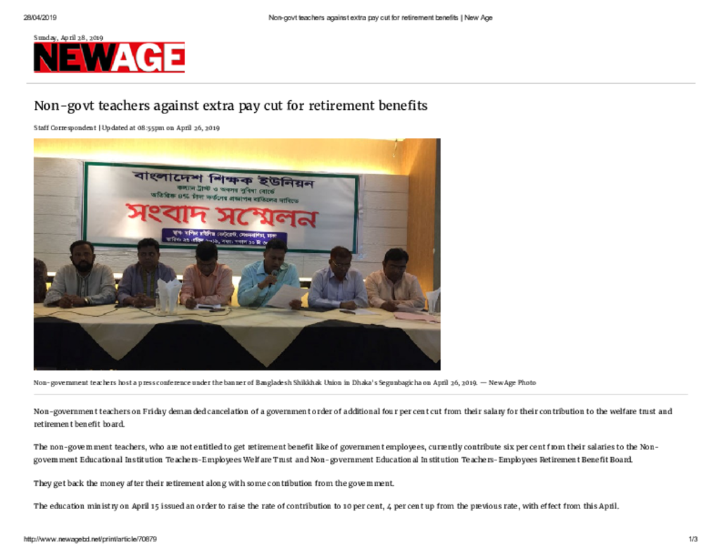 Non-govt teachers against extra pay cut for retirement benefits _ New Age Published on Newspaper New Age Category Educational Ministry / Departments Division Secondary and Higher Education Education Ministry / Division / Directorate Download