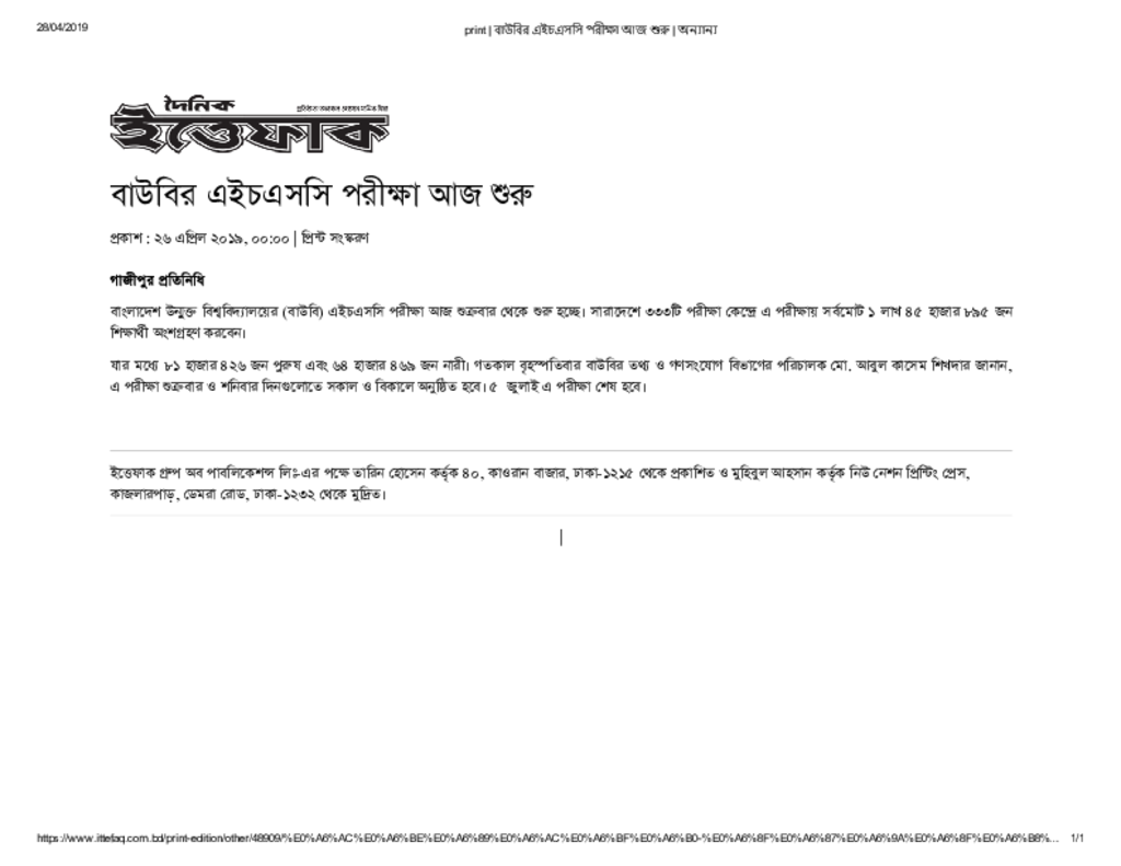 print _ বাউবির এইচএসসি পরীক্ষা আজ শুরু _ অন্যান্য Published on Newspaper দৈনিক ইত্তেফাক Category Public Examination Public Examination Others Download