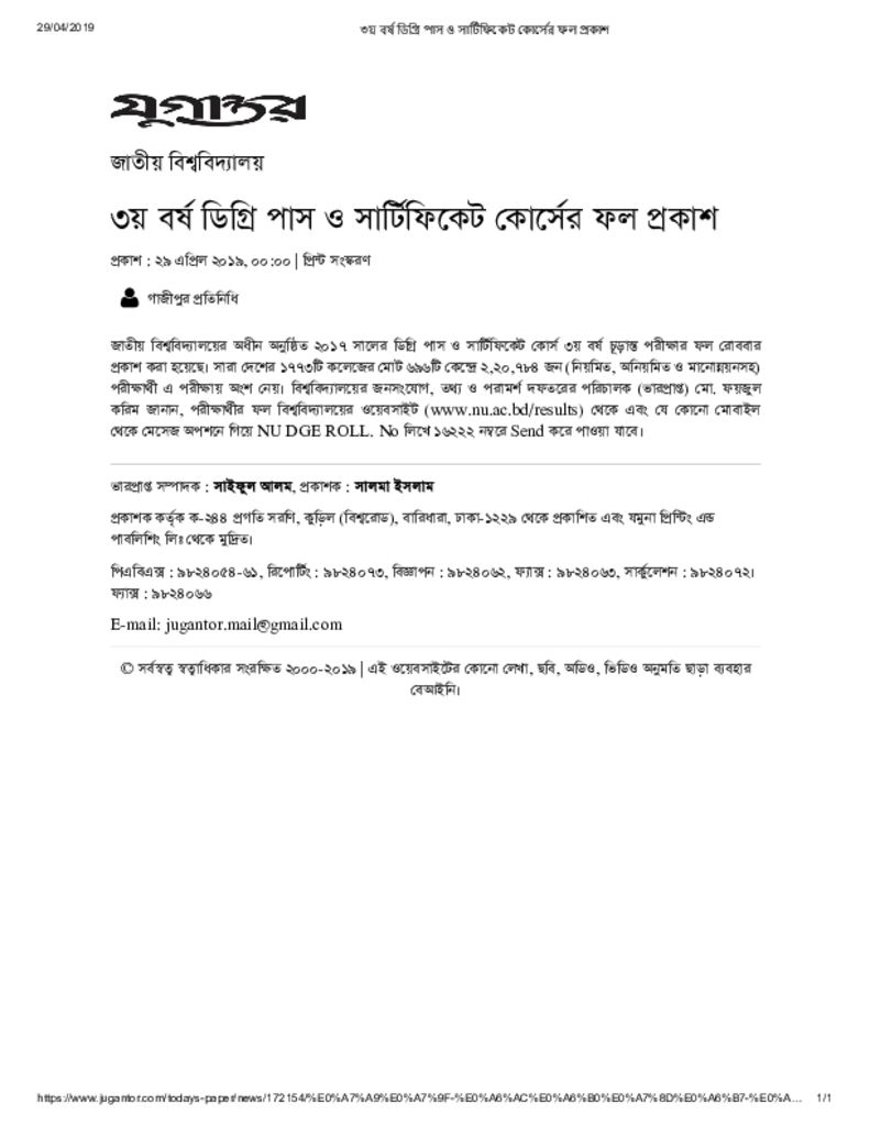 ৩য় বর্ষ ডিগ্রি পাস ও সার্টিফিকেট কোর্সের ফল প্রকাশ Published on Newspaper দৈনিক যুগান্তর Category Public Examination Public Examination Honors(Pass) Download