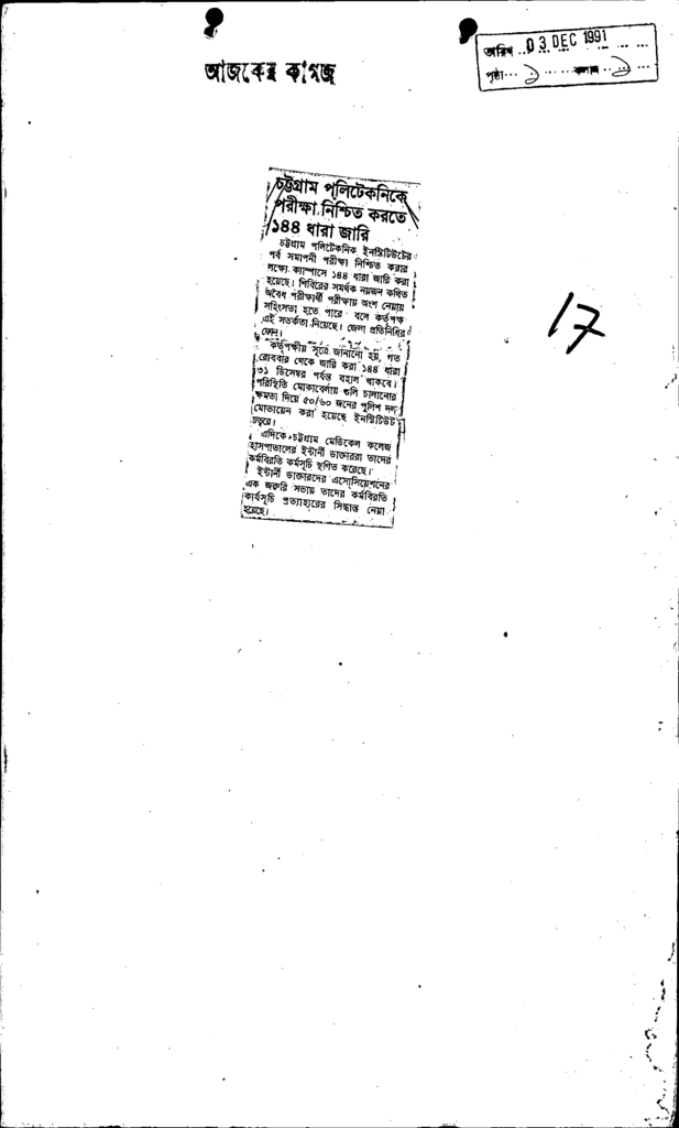 চট্রগ্রাম পলিটেকনিকে পরীক্ষা নিশ্চিত করতে ১৪৪ ধারা জারি Published on Newspaper দৈনিক আজকের কাগজ Category Technical and Vocational Education Download