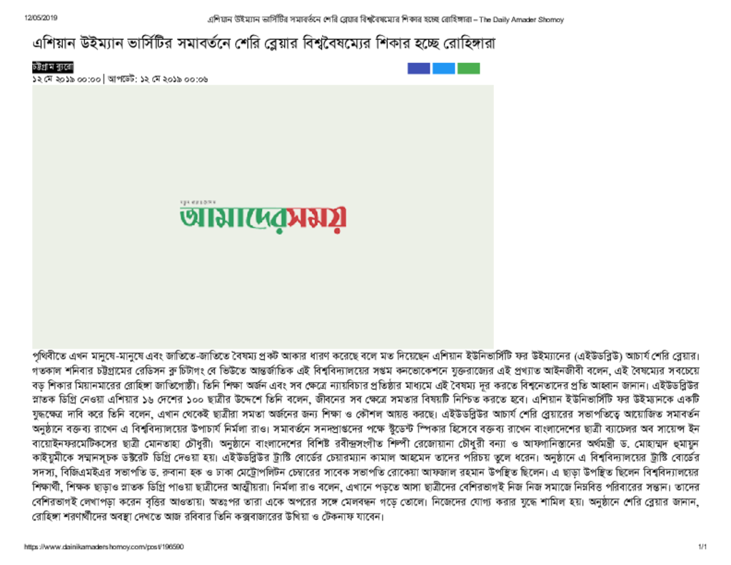এশিয়ান উইম্যান ভার্সিটির সমাবর্তনে শেরি ব্লেয়ার বিশ্ববৈষম্যের শিকার হচ্ছে রোহিঙ্গারা – The Daily Amader Shomoy Published on Newspaper দৈনিক আমাদের সময় Category Personal Opinion / Discussion / Commentary Download