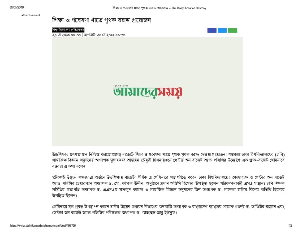 শিক্ষা ও গবেষণা খাতে পৃথক বরাদ্দ প্রয়োজন – The Daily Amader Shomoy Published on Newspaper দৈনিক আমাদের সময় Category Personal Opinion / Discussion / Commentary Download