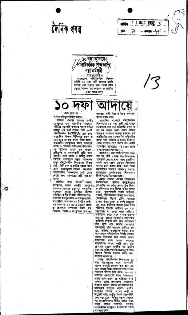 ১০ দফা আদায়ে পলিটেকনিক শিক্ষকদের নয়া কর্মসূচী Published on Newspaper দৈনিক খবর Category Technical and Vocational Education Download